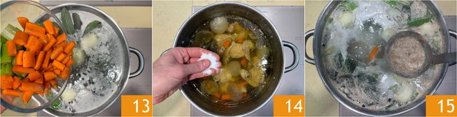Continue with celery and carrots 13. Add a handful of coarse salt 14 and bring back to a boil. Once boiling, lower the heat to a minimum. During the first 20-30 minutes of cooking, more foam will form on the surface, remove it with the ladle 15. Partially cover the pot with a lid and cook for at least 4 hours. The longer it cooks, the tastier the broth will be. Remove any foam that forms over time and clean the edges of the pot with a brush. If it reduces too much, you can add more water.