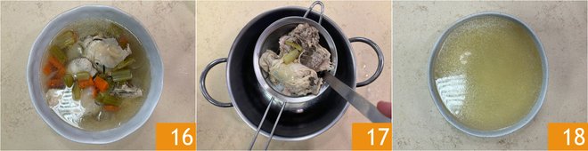 Once cooked, you can serve the capon immediately with the broth 16; alternatively, you can strain the broth through a colander 17 or cheesecloth and use only the broth for your preparations 18 and enjoy the boiled capon as a second course.