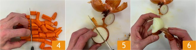 Do the same for the carrots 4. Cut the onions in half 5 and remove the skin 6.