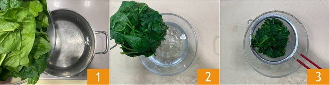 To prepare the cappellacci with shrimp and artichokes, first, take care of the fresh spinach egg pasta: blanch the spinach in salted boiling water 1 just enough to soften them. Drain and transfer them to a bowl with ice water to maintain the bright green color 2. Squeeze them with a strainer 3.