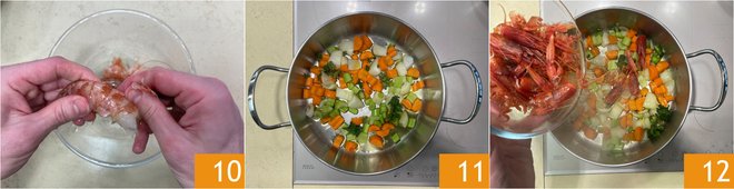 Clean the shrimp and keep the scraps 10. In a pot, sauté a bit of oil with a coarse chop of carrot, onion, and celery 11. Add the shrimp cleaning scraps 12.