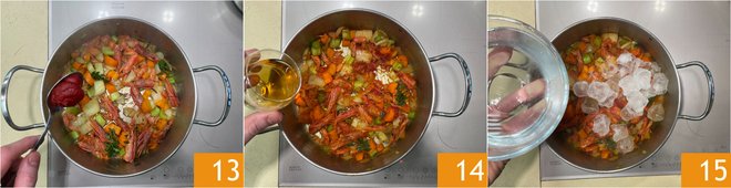 Add the marjoram and a tablespoon of tomato paste 13. Toast everything, then deglaze with cognac 14 and, if you prefer, you can also flambé with caution. Cover with cold water and ice 15.