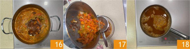 Cook the stock for 25 minutes on low heat 16. Then strain it through a strainer 17 and put it back on low heat 18 until it is reduced, this will take at least 20 minutes.