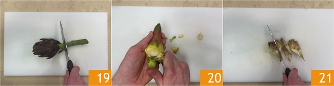 Now clean the artichokes: separate the stem 19, remove the tougher outer leaves and peel the tough outer part with a knife 20. Cut the hearts into wedges 21 and extract the internal fuzz.