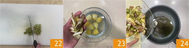 Peel the stem as well and cut it into pieces 22. Keep the cleaned artichokes in lemon water so they don't darken 23. In a pan, heat a bit of oil with a crushed garlic clove, add the artichokes 24.