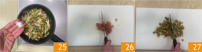 Add salt 25 and white pepper, then sauté them for about ten minutes to soften, adding a splash of water if necessary. Chop the cleaned shrimp 26 and cooked artichokes 27.