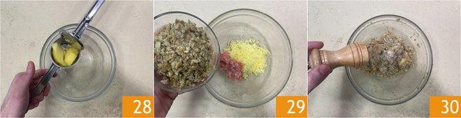 With a potato masher, mash the previously boiled potato to a puree 28, add shrimp and artichokes 29, salt, white pepper 30, and a drizzle of oil, then mix to combine.