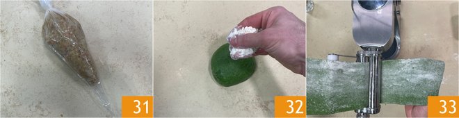 Transfer the filling into a piping bag 31. Retrieve the dough, lightly flour it 32 and pass it through the pasta machine 33 starting from the widest thickness to reach a thickness of about 1/8 to 1/12 inch.