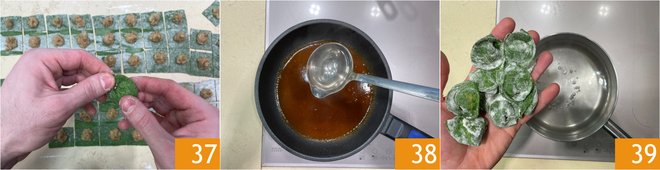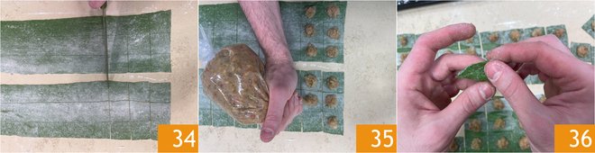 Cut squares of about 2 1/2 x 2 1/2 inches 34. Fill with the filling 35 by squeezing balls of mixture. Now close the pasta by matching the corners to form a triangle 36.