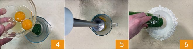 Transfer the spinach into a jug, add the eggs 4, salt, and a drizzle of oil. Blend with an immersion blender 5 to obtain a cream. On the work surface, pour the flour in a fountain shape, place the spinach cream in the center 6.