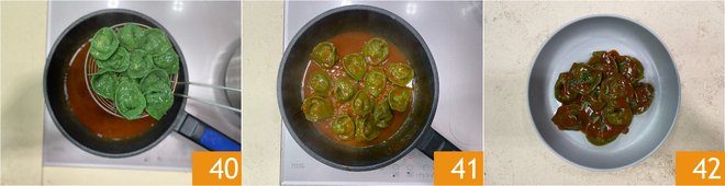 Fold the two ends towards the center and join the two ends 37. Meanwhile, bring water to a boil for the pasta. Transfer the reduced stock to a large pan with a ladle of the cappellacci cooking water. Boil the cappellacci until they rise to the surface 39, it will take just a few minutes.