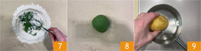 Mix first with a fork 7 then continue by hand until you get a smooth and compact dough 8. Cover with plastic wrap and leave in the fridge for 30 minutes. Meanwhile, prepare the filling: boil the potato 9 until it is soft.