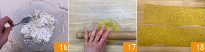 Mix everything to obtain a homogeneous mixture 16, transfer the mixture to a piping bag without a nozzle, and keep it in the fridge. After the pasta resting time, take the dough ball and divide it into 2 parts. Flatten the dough first with a rolling pin 17, enough to obtain a sheet that can pass between the rollers of the pasta machine. Roll out the pasta passing from the thickest roller down to a thickness of 1 millimeter 18. After rolling out the first sheet, be sure to cover it with a damp cloth to prevent it from drying out while you work on the second.