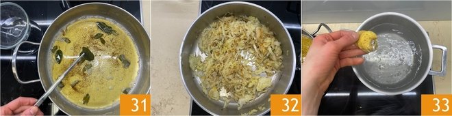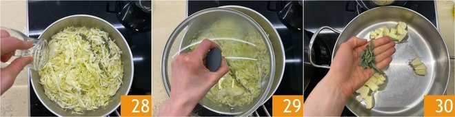 Cook until the butter takes on a slightly amber color and the sage leaves become crispy 31. Set the leaves aside to garnish the plates and keep the aromatic melted butter. By this time, the cabbage will also be cooked 32, so you can boil the cappellacci in salted boiling water 33; it will take about 2-3 minutes.