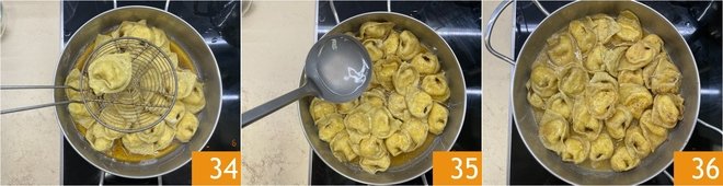 Drain the cappellacci into the pan with the brown butter 34, add a scant ladle of cooking water 35, and toss to flavor 36.