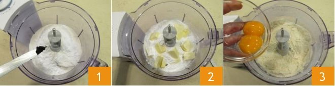 To prepare the caramelized fig tart, start with the preparation of the Shortcrust pastry. Place in the bowl of a food processor fitted with blades: flour, powdered sugar, a pinch of salt, and the seeds of a vanilla bean 1 (to extract them, simply cut the bean and scrape the contents with a sharp knife). Also add the cold butter from the refrigerator, cut into cubes 2, and run the mixer until the butter is as fine as sand, then add the egg yolks 3.