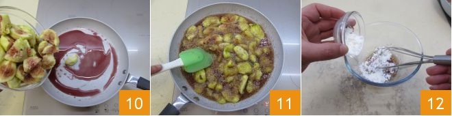 Let the sugar dissolve with the wine over low heat and add the figs 10, stir everything together and let it cook for about 20 minutes 11. Once cooked, collect a few tablespoons of the juice they released and add it to a small bowl with the cornstarch, and whisk quickly to avoid lumps 12.