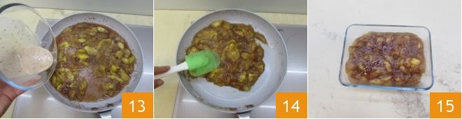 Add the liquid back into the pan 13, stir and let everything cook for 5-6 minutes until the compote thickens 14, and place it in a baking dish to cool 15.