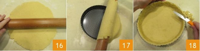At this point, take your pastry from the refrigerator and roll it out on a lightly floured surface, creating a circle about 1/8 inch thick 16. Using a rolling pin, lift the rolled-out pastry and gently place it on a 9.5-inch circular tart pan 17. Press the pastry into the pan and use a small knife to trim any excess that hangs over the edges 18.