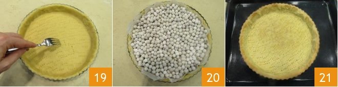 Prick the bottom of the tart with the tines of a fork 19, place a disc of parchment paper over the tart and pour in ceramic baking beads 20 (or dried beans), so that during baking the pastry doesn't puff up. Proceed with blind baking, baking your pastry in a preheated static oven at 355°F for 20 minutes (if using a convection oven, bake the crust at 320°F for about 15 minutes). Then remove the beads and continue baking for 5-6 minutes during which the pastry should turn golden but not overbake 21.