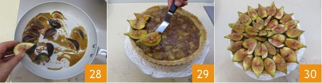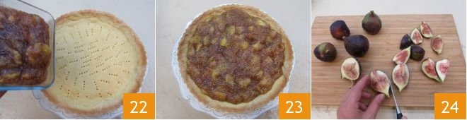 Let the pastry cool and only when the fig compote is also cool can you pour it over the base of your tart 22. Smooth the surface well 23 and start caramelizing the figs. Clean the figs needed for decoration by rinsing them very gently with cold water and, without peeling them, cutting them into 4 wedges 24.