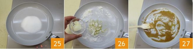 Place the sugar in a pan 25 and let it caramelize, adding the butter as soon as the sugar starts to dissolve 26. Stir with a wooden spoon until you obtain an amber caramel 27.