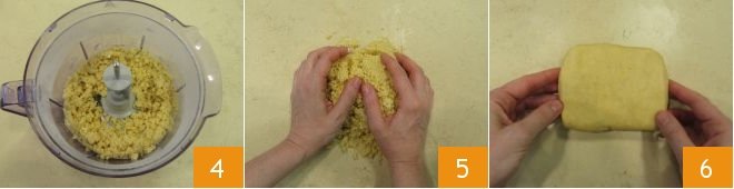 Blend again until you get large crumbs 4. Transfer the mixture to a work surface and quickly work it with your hands 5, without warming it too much. Once you have a homogeneous mixture, shape it into a disc 6, wrap it in plastic wrap, and refrigerate for at least 30 minutes.