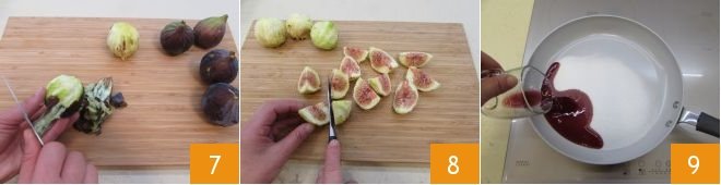 Meanwhile, work on the fig compote. Peel your figs 7 and cut them into 4 wedges 8. Pour granulated sugar into a saucepan, along with the wine 9.