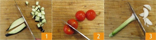 To prepare cardamom rice with eggplants, first, prepare the vegetables: trim the eggplants and cut them into 3/4 inch cubes 1, then cut the cherry tomatoes in half 2. Clean the spring onion and slice it thinly 3.