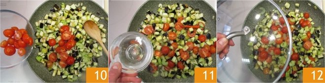 Finally, add the cherry tomatoes 10 and a little water 11, cover with a lid, and cook over medium heat for 5 minutes 12.