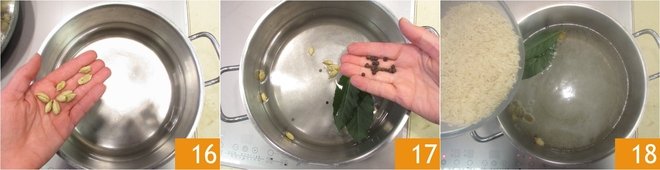 Meanwhile, bring a pot of water to a boil to cook the rice flavored with cardamom seeds 16, bay leaves, and peppercorns 17. Pour the basmati rice into the boiling water 18 and cook for about 10 minutes.