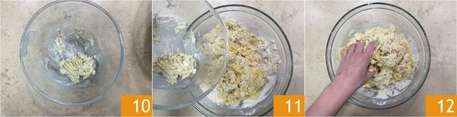 Once you have obtained a cream 10, add it to the dough 11 and work it again with your hands in the bowl 12.