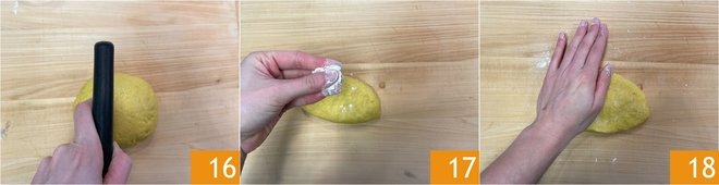 When the mixture begins to take shape, transfer it to a work surface 13 and knead it for about ten minutes until you get a smooth and homogeneous dough 14. It should be firm yet pliable. If it's too hard, add 5-10g of water. Wrap it with plastic wrap and let it rest for 30 minutes at room temperature 15.