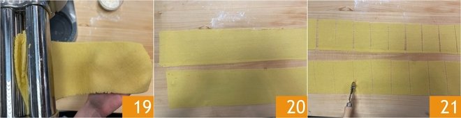 Then pass it several times through a pasta machine, gradually reducing the thickness 19 and folding the dough before inserting it again. You should obtain strips 1/16 inch thick 20. Let the sheets dry slightly for a few minutes, then use a fluted pastry wheel to cut rectangles approximately 2x4 inches 21.