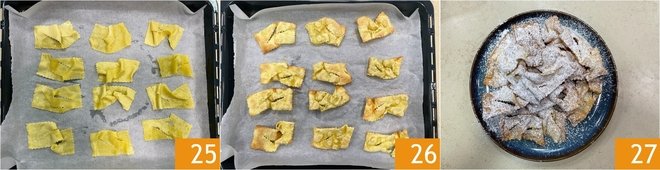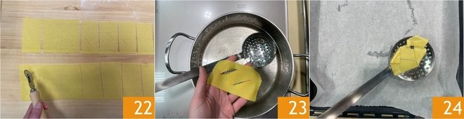 Make diagonal slits in the center 22, then blanch the chiacchiere in boiling water 23 until they float. Drain them with a slotted spoon and transfer them to a baking sheet lined with parchment paper 24.