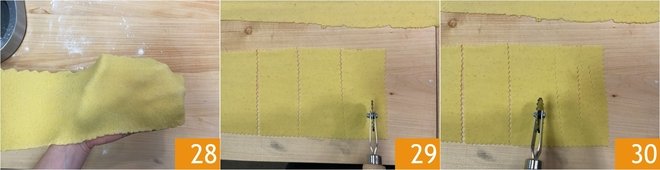 To prepare fried chiacchiere, take part of the dough and roll it out as before to a thickness of 1/16 inch 28. Let the sheet dry slightly and then use the fluted pastry wheel to cut rectangles measuring 2x4 inches 29, making cuts in the center lengthwise 30.