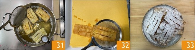 Fry a few chiacchiere at a time in plenty of hot vegetable oil 31. The ideal temperature is between 300-320°F; we recommend using a thermometer to measure it for perfect frying. When they are nicely golden, drain them with a slotted spoon and transfer them to paper towels 32. Let cool and serve dusted with powdered sugar 33.