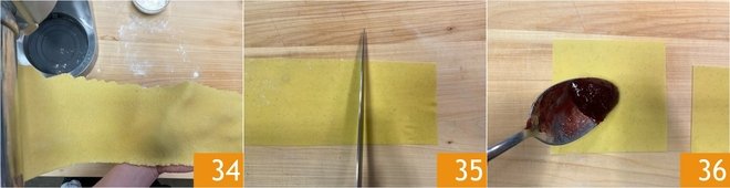 Finally, we will show you how to prepare filled and fried chiacchiere. You will need to roll the dough several times through the machine, gradually reducing the thickness until you obtain a sheet 1/16 inch thick 34. From this, simply cut 4x4 inch squares and fill them by placing a teaspoon of jam in the center 36.