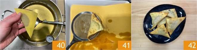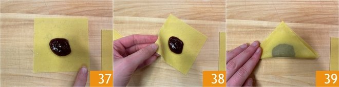Moisten the edges of the dough 27 and fold the filled chiacchiere 38 into triangles. Press the edges well, squeezing out all the air 39. Prepare all the others in the same way.