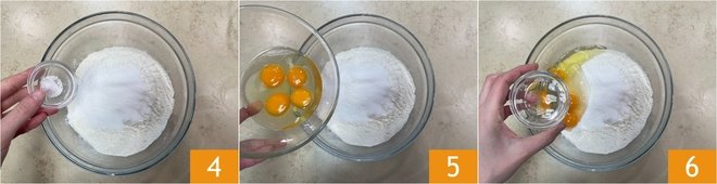 Add a pinch of salt 4, 3 eggs along with the yolk 5, and the grappa 6.