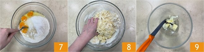 Start kneading with a spoon 7 and then work for a few minutes by hand 8. Pour the softened butter into a bowl, add the seeds from the vanilla pod 7, and mash it with a fork.