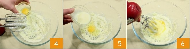also add an egg 4 and the condensed milk 5. Work the ingredients to whip and combine them 6;