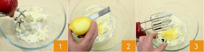 To prepare the carnival cupcakes, work the butter with the sugar in a bowl using an electric mixer 1 or a wooden spoon. Grate the zest of an untreated lemon 2 and add the seeds of a vanilla pod 3 (or a sachet of vanilla sugar);