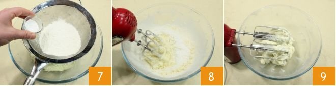Add the sifted flour and baking powder to the cream 7, then work everything until you get a smooth mixture 9.