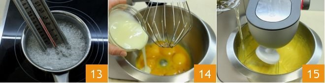Meanwhile, heat the water with the sugar in a saucepan, stirring occasionally with a spatula. When the sugar has dissolved, place a kitchen thermometer in the saucepan 13 and without stirring further, bring the syrup to 250°F. While the syrup is reaching temperature, place the egg yolks in a stand mixer (or work them with an electric mixer), add the condensed milk 14, and start whipping them. When the syrup has reached the temperature, pour it slowly over the yolks while continuing to beat 15: you will need to continue working the mixture until it has completely cooled.