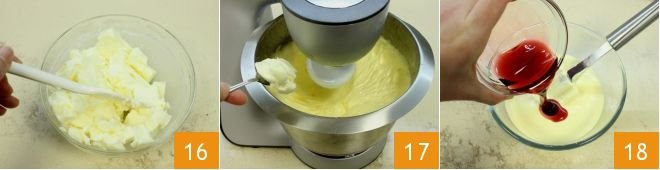 Then cream the room temperature butter, helping yourself with a spatula 16. Gradually incorporate the butter into the rest of the mixture 17, beating until creamy. Once the buttercream is ready, divide it into three small bowls: one can be left white, into the others you can pour the cherry syrup 18,