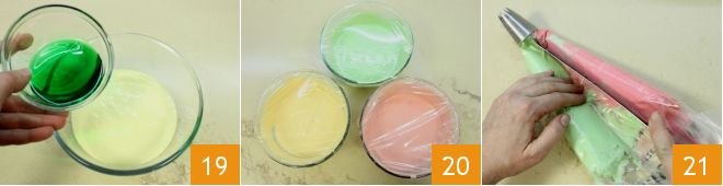 and the mint syrup 19 to have three different colored creams. Squeeze the gelatin sheets previously soaked and dissolve them in 1/4 cup of warm liquid cream, stirring until completely melted. Divide this mixture into the two bowls with the colored creams. Place the creams in the refrigerator to firm up for at least 30 minutes, covered with plastic wrap 20. When the cupcakes are well-cooled, transfer the creams into three disposable piping bags without a nozzle, and then insert them into another piping bag with a fairly wide star nozzle 21.