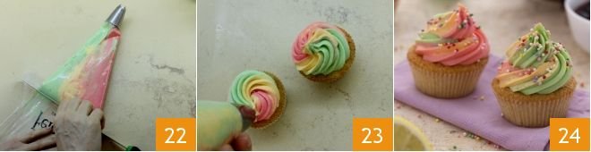 With the blade of a knife, you can squeeze the piping bag to bring the creams towards the tip and facilitate the expulsion 22; decorate the carnival cupcakes with a swirl of the three colored creams 23 and garnish with colored sprinkles 24!