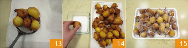 Place the fritters on a tray lined with paper towels to absorb the excess oil, then roll them in granulated sugar 14. Your Carnival fritters are ready to enjoy 15!