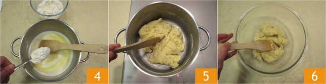 When it reaches a boil, remove the saucepan from the heat and add the sifted flour along with the baking powder 4, and stir vigorously. Then return the saucepan to low heat and continue stirring for 2-3 minutes until you obtain a homogeneous mixture 5. Transfer the mixture to a bowl and let it cool slightly 6.